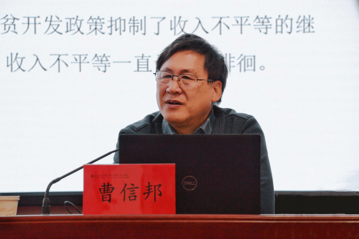 首先,曹信邦教授以中国式现代化为切入点,引出了实施共同富裕道路这一议题。他以翔实的数据,以收入与财富不平等为内容,论证阐释了中国实现共同富裕的现实背景。随后,曹信邦教授介绍了中国共产党关于共同富裕的论述及其思想来源,认为共同富裕不是简单的对现有财富的平均分配,而是普遍富裕基础上的差异富裕、是物质生活和精神生活的全面富裕。然后从资本—劳动报酬分配关系的变化、新技术革命与全球化金融化等角度分析收入与财富不平等的原因,从居民收入分配、要素评价与报酬分配、再分配的收入差距调解效应、数字技术(人工智能)、人口老龄化等角度分析了实现共同富裕目标进程中所面临的五大困境。最后,曹信邦教授立足中国国情,就如何实现共同富裕提出见解。他认为,以“提低”“扩中”“调高”为主线的收入分配制度改革是实现共同富裕的有效路径,并以此提出了具有前瞻性的政策建议。