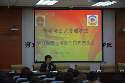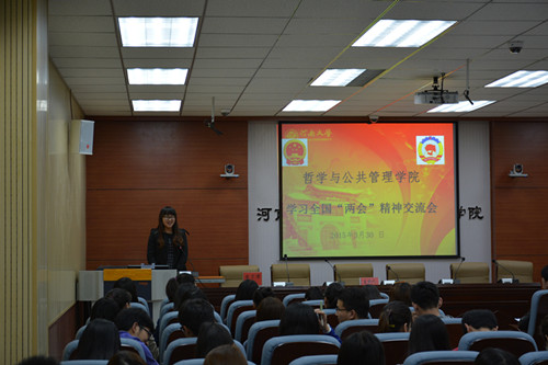 随后,五位研究生党员代表结合老员工自身进行了“两会”精神经验交流。刘旸针对“两会十大关键词”解读了2015年全国两会政府工作报告并结合“经济新常态”观点详细阐释了两会政府报告精神。他认为,稳增长、调结构、简政权、重民生是本次政府报告的核心所在。韩阳阳则从必要性和重要性解读了全国人大常委会工作报告并突出解释修改立法法的目的。结合报告,修改立法法是认真贯彻落实党中央决策部署的需要,更是完善立法制度的要求,其重要性不言而喻。朱大帅则结合“四个全面”详细分析了张高丽、赵乐际参加河南代表团讲话精神,并以郑州航空港经济综合实验区的发展与一带一路区域发展为例分析了河南省发展的十大机遇。冯超在讲解“李克强总理答记者问”时,重点分析了台湾、中国搭便车和中美关系等问题,充分展现了彰显大国总理的民本情怀。最后房圣康带领大家聚焦“河南团关注的热点”,本次两会河南团不仅仅关注本地长远发展的战略问题,更关注全面深化改革、促进农村农业发展,推进教育、文化、卫生等社会主义建设以及国家筹建亚投行等关系国计民生的大事,展示了我中原儿女宽阔的胸襟与历史担当。