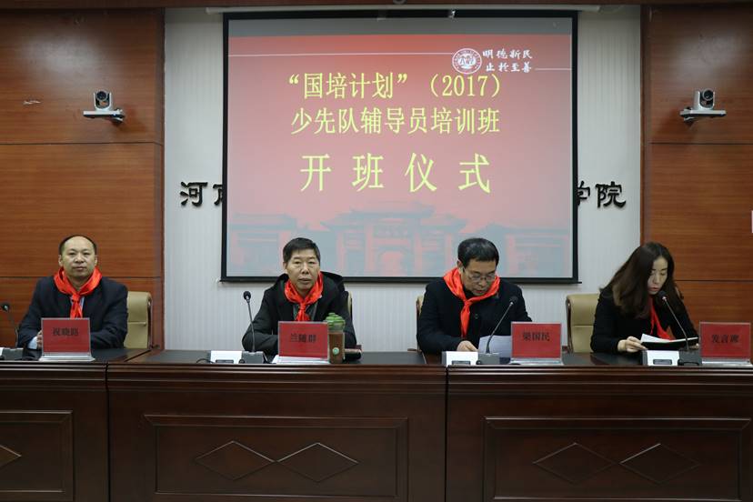 开班仪式由梁国民老师主持。学员代表向出席仪式的领导敬献红领巾,随后祝晓路副经理致欢迎词,学员代表陈晓力代表全体学员发言。兰随群副主任做了重要讲话,他代表团省委肯定了bwin必赢“国培计划”少先队辅导员培训的工作,表达对bwin官网的谢意。他结合党的十九次代表大会以及习近平总书记重要讲话精神,立足河南省少先队辅导员的现状,肯定全省少先队工作取得的成果,并建议少先队辅导员们深刻学习党的十九大精神和抓重点项目。他希望广大辅导员积极参加培训,提高认识,增强责任感和使命感,全面提高少先队工作专业能力和水平,不辜负团中央、团省委期望。