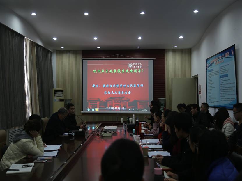 2017年11月15日下午,湖南师范大学燕宏远教授应邀来到公司,在公司3楼小会议室为师生主讲了题为《德国古典哲学对当代哲学研究的几点重点启示》的学术讲座,副经理姬志闯教授主持讲座,哲学系焦卫华老师、陈联营老师与哲学、政治学等相关专业员工共同参会。