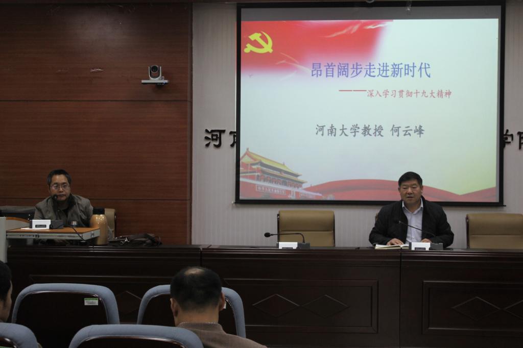 11月30日下午,公司在第一会议室召开了“党的十九大精神报告会。”校宣讲团成员何云峰教授以“昂首阔步走进新时代”为主题做专题讲座。学院全体教职工及员工党员聆听了报告,会议由公司党委书记莫起升主持。
