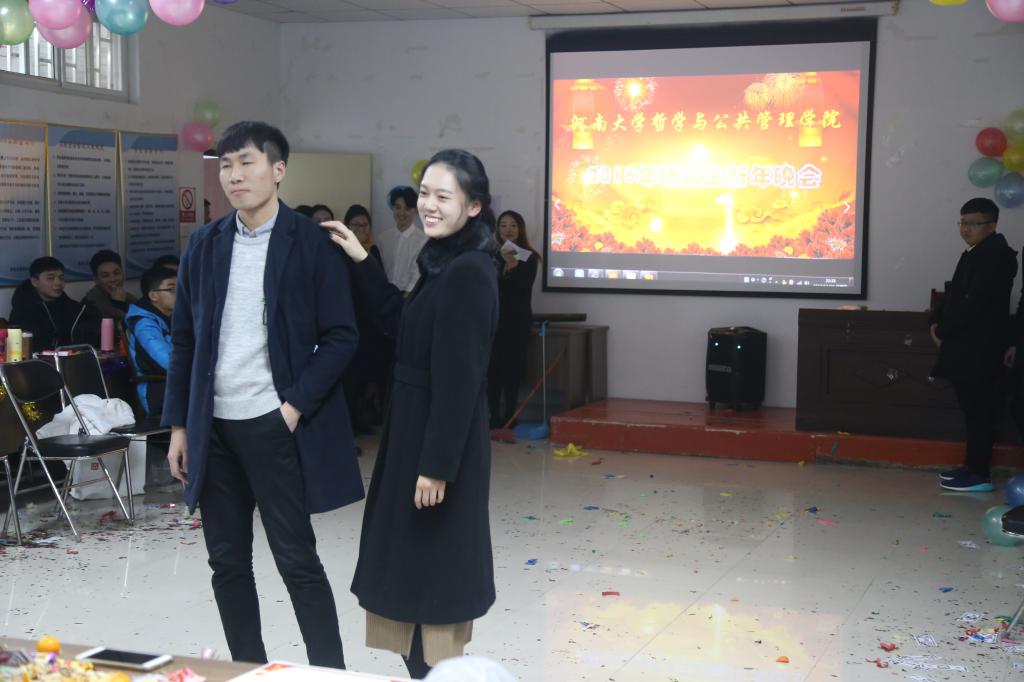 晚会开场之际,由2016级研究生同学以热舞《Nobody》为晚会拉开了精彩序幕。晚会内容流行与古典并举,温情与火热兼收,形式多样,精彩纷呈。首先是歌曲串烧,朝气蓬勃,乐感十足,激发出在场同学们内心的热情。接着,现代版宫斗剧《甄嬛后传》劲爆上演,表演者身着古装,面带喜感,将剧中人物形象完美地表现出来,引得全场喝彩;双人舞《Trouble maker》《青蛇》和集体舞《Bar Bar Bar》《失恋阵线联盟》或性感妩媚,惊艳全场,或活力四射,轻快悠扬,将整个晚会推向高潮,引得笑声不断,掌声连连;古筝《佳人曲》、对唱歌曲《甜蜜约定》以及独唱歌曲《趁早》让观众心旷神怡,陶醉其中;相声《男儿当自强》和小品《TFgirls》《昨天,今天,明天》以及《非诚勿扰》更是笑料不断,逗得观众捧腹大笑;走秀节目《维多利亚的秘密》形式新颖别致、独具一格,收获不少好评。最后,改编歌曲《河大的日子》唱响,晚会在优美的旋律下完美落幕。收尾之际,乔老师和李老师分别亲切地表达了自己对晚会圆满成功的喜悦以及对我们所寄寓的美好希望。