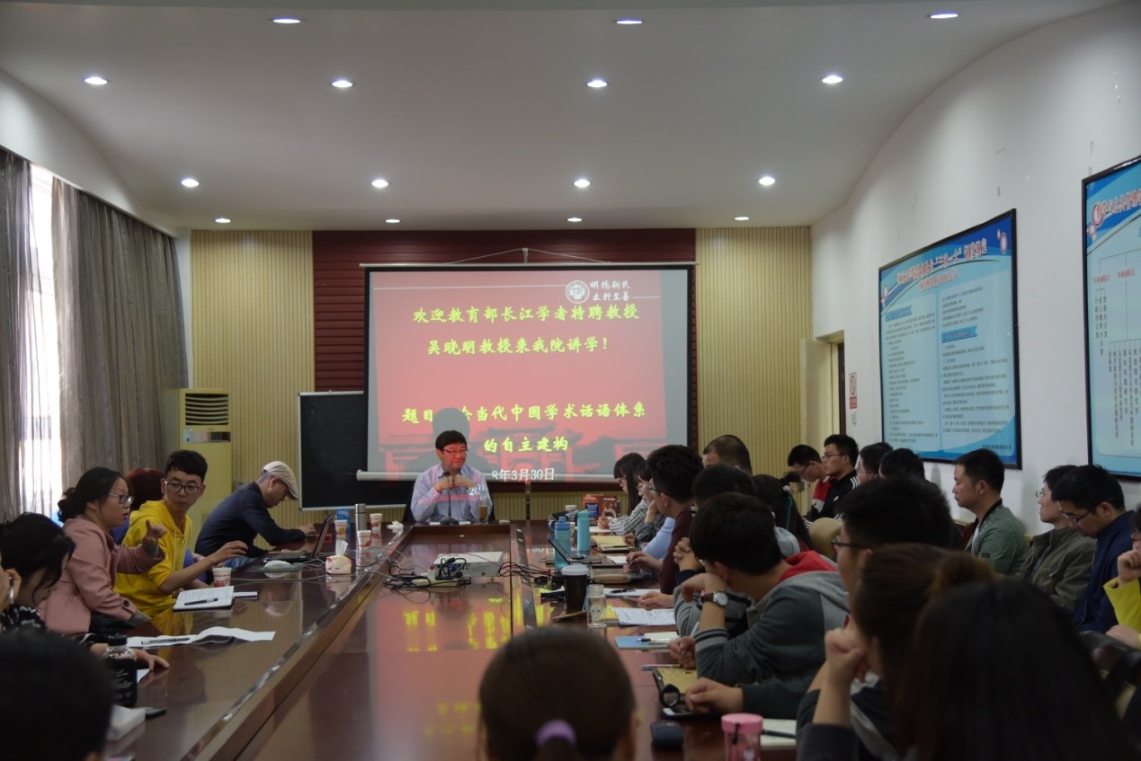 2018年3月30日下午,教育部特聘教授、复旦大学哲学学院经理吴晓明教授应邀来到公司,在公司3楼会议室为公司师生带来了题为“论当代中国学术话语体系的自主建构”的学术讲座,讲座由公司哲学系吕世荣教授主持,学院部分老师以及哲学等相关专业的员工参会。