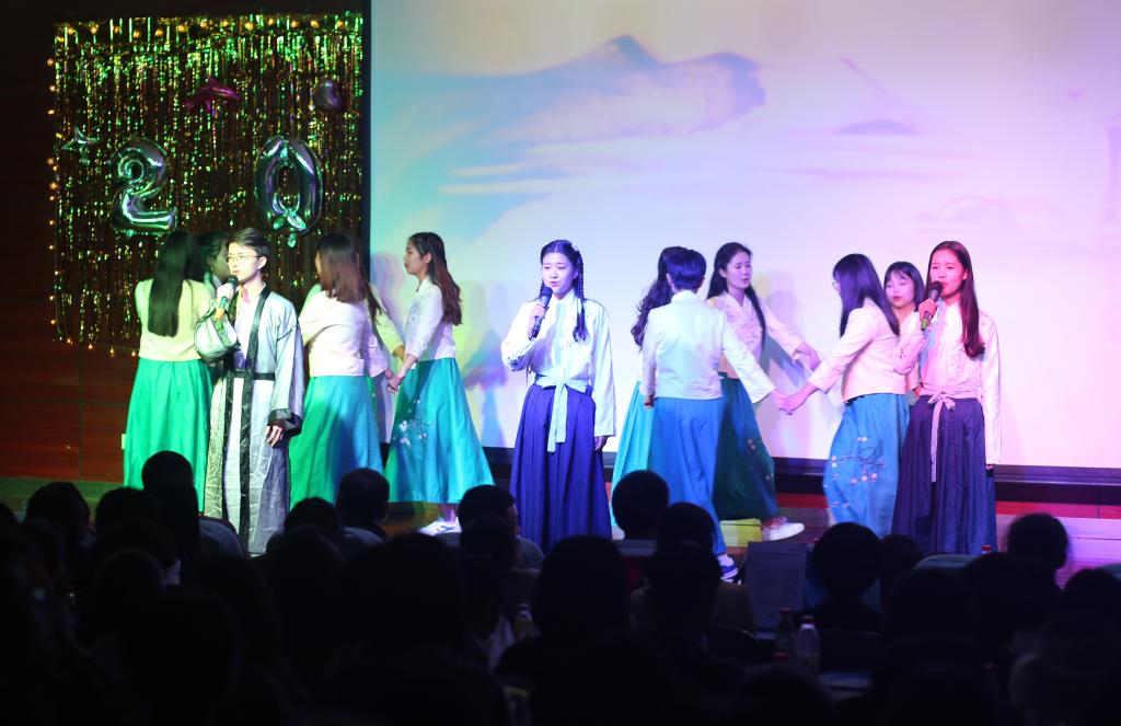 晚会在炫酷的热舞中拉开序幕。诗朗诵《关雎》再现古诗文音韵美,一句“关关雎鸠,在河之洲”,将观众带入绝美的意境:成双成对的雎鸠在沙洲上嬉闹追逐,华羽流光,声音婉转。古诗新唱,赋中见兴,景中见情,意境优美。绚丽灯光与柔美音乐交相辉映,温婉悠扬的歌曲《你曾是少年》将青春力量注入每一个音符;小品《我的路》幽默风趣,欢乐中给人启迪:坚持梦想,走自己的路;刚柔并济的跆拳道《武道魂》瞬间点燃晚会现场的气氛;歌曲《风吹麦浪》令人忆起金色时光,展现出学院老师多才多艺的一面。更有阳光时尚的T台秀、余音绕梁的歌曲串烧、曼妙多姿的华尔兹《致青春》让人应接不暇。整场晚会精彩纷呈,高潮迭起,引来台下阵阵掌声,欢呼声一浪高过一浪。过往不忘,未来可期,歌曲《光阴的故事》为晚会画上句号。晚会期间穿插游戏与抽奖环节,增强晚会的趣味性,也为师生们送去了欢乐与祝福。