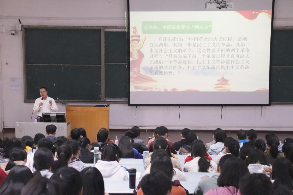 何云峰从中国共产党人的初心和使命切入,从三个不同时代讲述了“为人民谋幸福,为民族谋复兴”的含义,并带领同学们回顾了新中国70年的光辉奋斗历程。第一个时代,毛泽东时代,是社会主义革命和建设时期。他从新民主主义建设、社会主义基本制度建立、全面建设社会主义、“文化大革命”四个阶段,逐层分析,步步深入,以生动有趣的故事,通俗易懂的话语,向同学们阐述新中国成立之初的建设过程。第二个时代,“邓、江、胡时代”,是改革开放和社会主义现代化建设新时期。他从该时期的目标、方法以及道路出发,介绍了中华民族富起来的历史进程。当今习近平时代作为第三个时代,是中国特色社会主义新时代。他以新时代全面从严治党为主要内容,强调新时代是中华民族强起来,实现民族伟大复兴中国梦的重要阶段。讲座让同学们受益良多,会场内掌声不断。