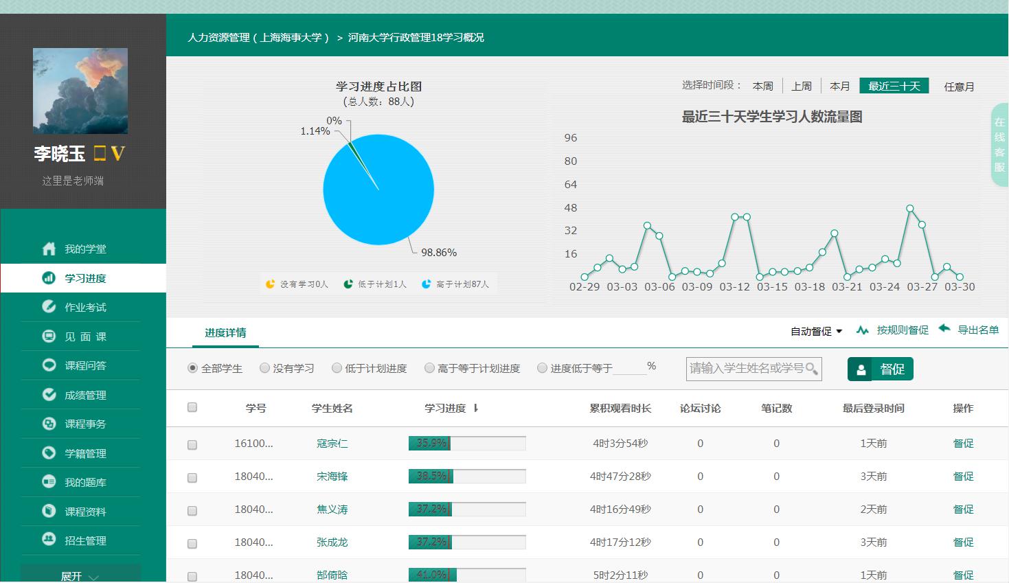 2019-2020学年第二学期承担2018级行政管理专业本科生《人力资源管理》等相关课程教学工作。恰逢新型冠状病毒疫情的发生,在“停课不停学”的要求下,积极探索新型的网上教学新模式,采取课前、课中、课后“三位一体”的线上线下相结合教学模式。