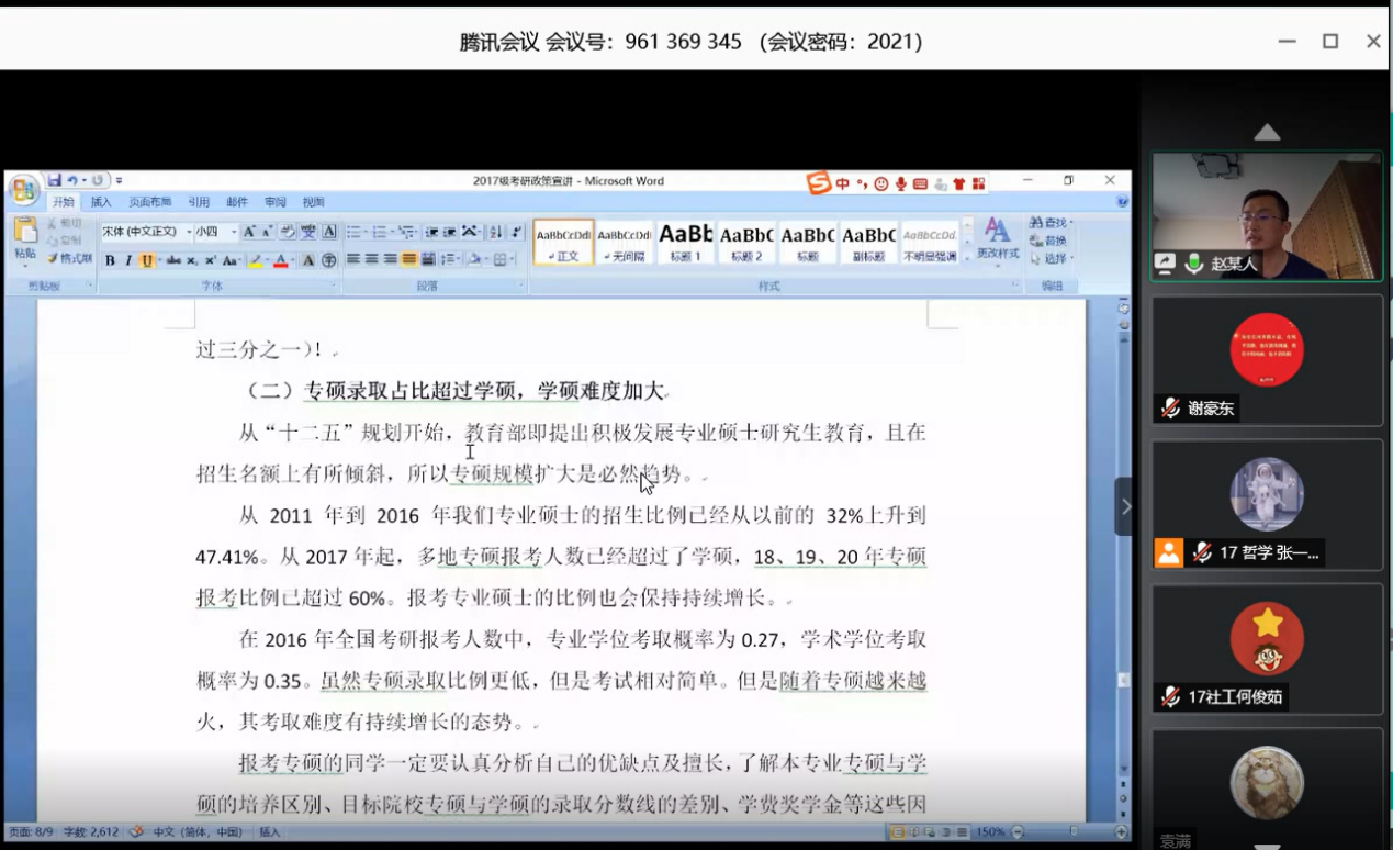 5月28日下午,学院以腾讯会议为平台,开展了线上考研政策宣讲会。宣讲会主题为“把握宏观趋势,科学做出选择”,学院副经理赵炎峰出席会议并担任主讲,2017级140余名员工参会。