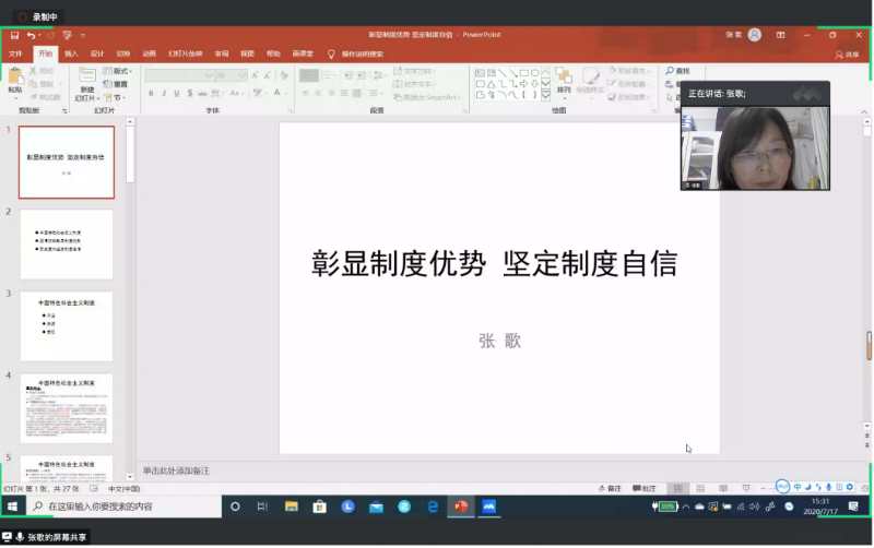 7月17日下午,公司“党课开讲啦”第三讲通过“腾讯会议”开讲。劳动与社会保障系张歌副教授以“彰显制度优势坚定制度自信”为题开讲。学院全体党员及入党积极分子聆听了本次党课。