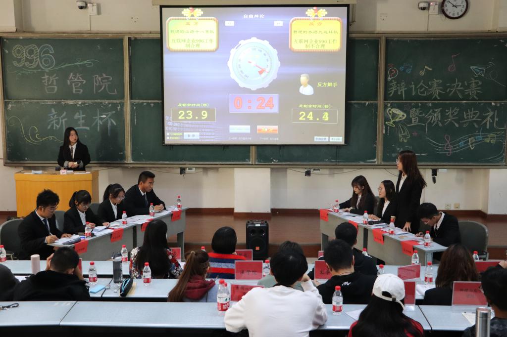聚焦当下实事,关注社会发展。第一次场比赛以“互联网企业996模式是否合理”为辩题,正方一辩从个人需要、企业竞争、国家发展三个角度出发,阐述996模式存在的合理性。反方一辩则从个人健康、薪酬不公等方向思考,论述了996对劳动者精神与身体的双重剥削。攻辩环节,双方辩手针对破绽发起攻势,场面激烈,比赛气氛不断升温。在自由辩论和总结陈述环节,双方更是旁征博引,言辞犀利。青春燃似火,争辩露锋芒。第二场比赛围绕“网络购物节是不是一种成功的商业模式”展开辩论,正方先入为主,开篇立论,坚定表明观点。反方则结合心理学、经济学等专业知识有力地阐述观点。双方或一针见血,或循循善诱,将比赛不断推向高潮。最后的总结陈词环节,双方四辩凭借出色的逻辑能力与表达能力概括本方观点。整个比赛过程中辩手们妙语连珠,引经据典,风度优雅,思维敏捷,用实力呈现了一场视听盛宴。赛后,评委对辩手们进行了仔细的点评。