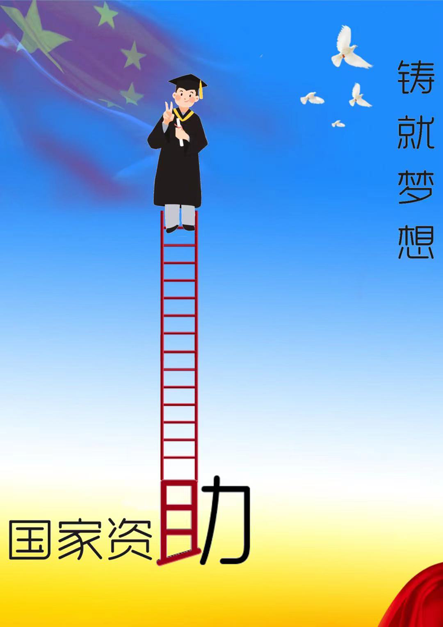 作品简介:在党和国家资助政策的帮助下,贫困学子可以更轻松地去追求梦想。他们一步步脚踏实地走向更广阔的世界,与蓝天并肩、与白鸽共舞,在红旗下为社会主义建设贡献自己的力量,实现自己的价值。