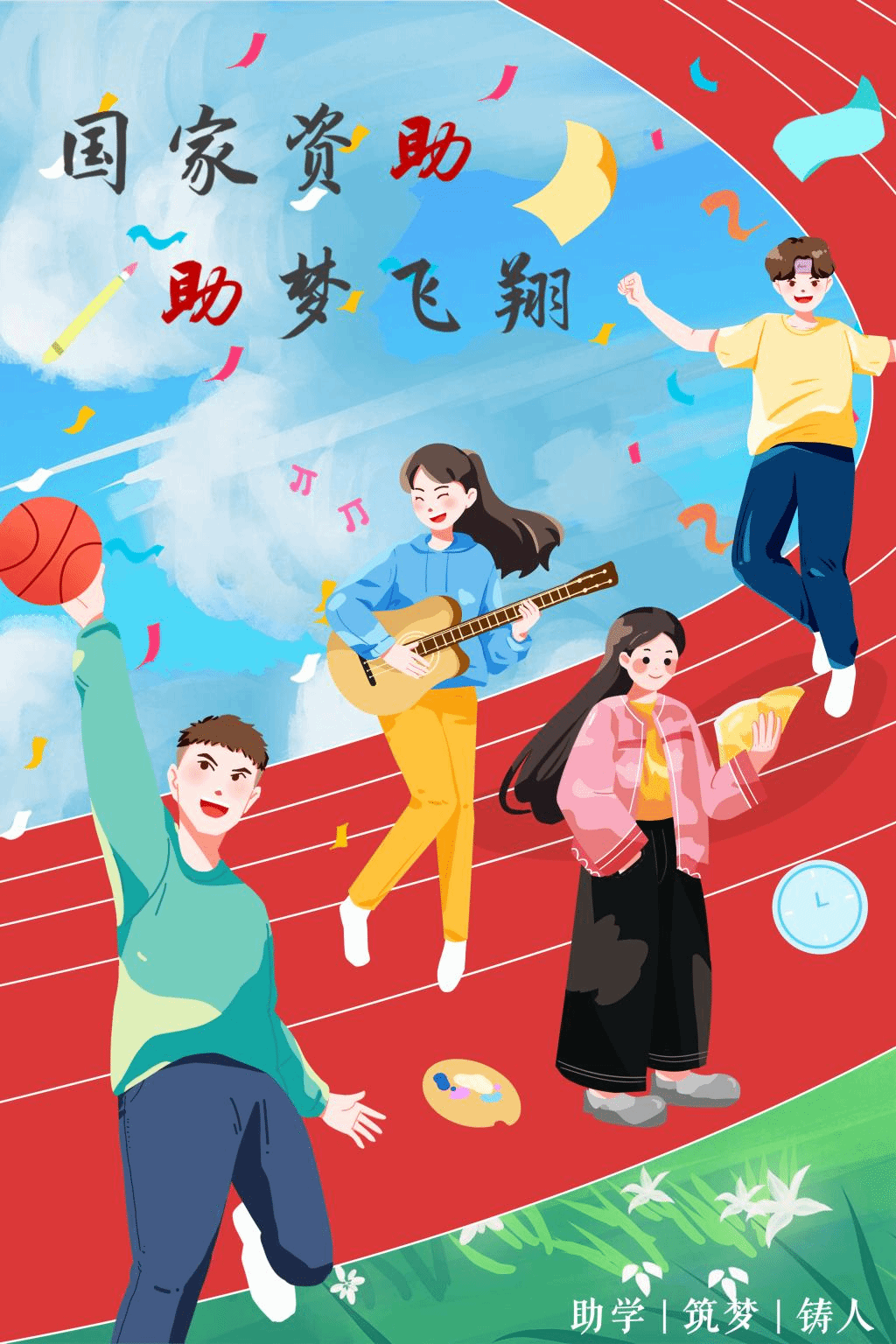 作品简介:海报以蓝天、草地、跑道为主要背景元素,象征充满青春活力的校园环境。海报中的四个青年,或在运动挥洒汗水,或在弹奏吉他,或在阅读书籍,共同闪耀青春光芒。而在校园生活多姿多彩、青春梦想纵情飞扬的背后,正是国家资助政策的支持与助力。