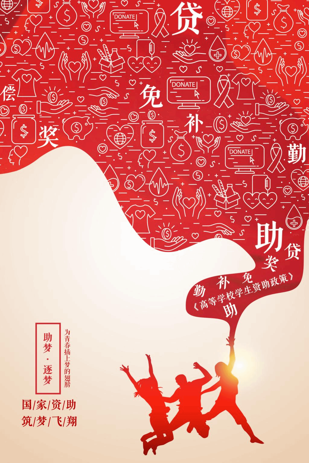 作品简介:以红色为主色调,三个青年跳跃姿态的剪影为主体,将高校员工资助体系从“偿、贷、免、补、奖、助、勤”七个关键字方面予以突出。