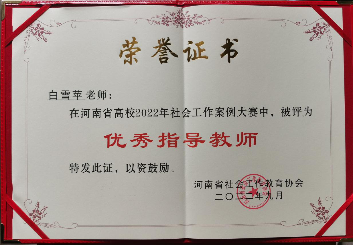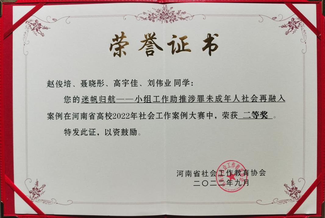 近日,河南省社会工作教育协会主办、洛阳师范学院承办的河南省高校2022年社会工作案例大赛结果公布,公司选送的案例《迷帆归航——小组工作助推涉罪未成年人社会再融入》在省内17所高校、49支队伍中脱颖而出荣获本科生组二等奖。团队指导教师白雪苹获河南省高校2022年社会工作案例大赛优秀指导教师。