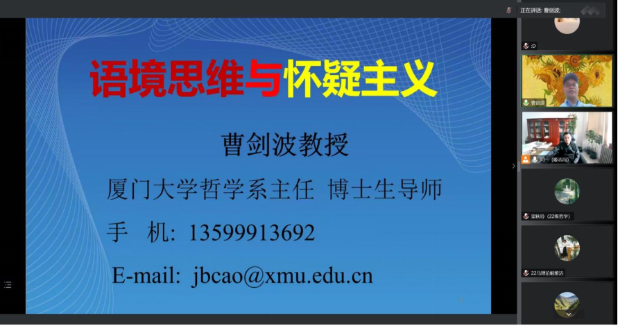 11月1日下午,厦门大学曹剑波教授应邀在线上为公司师生作了题为《语境思维与怀疑主义》的学术报告。讲座由经理姬志闯教授主持,公司全体师生通过线上的方式共同参与了此次讲座。
