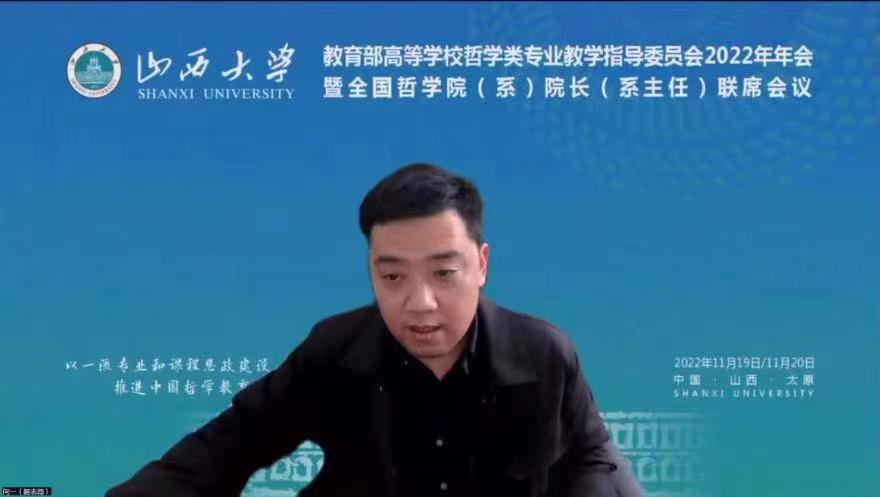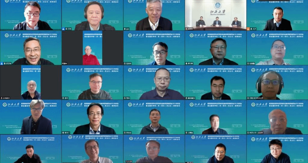 2022年11月19日至20日,教育部高等学校哲学类专业教学指导委员会(以下简称“哲学教指委”)2022年年会暨全国哲学院(系)经理(系主任)联席会议召开。哲学教指委委员及哲学院(系)经理(系主任)等120多位专家学者出席会议。本次会议由山西大学哲学社会学学院承办,采用线上形式进行。会议的主题是全面学习贯彻党的二十大精神,深化本科教学改革,提高公司产品质量。