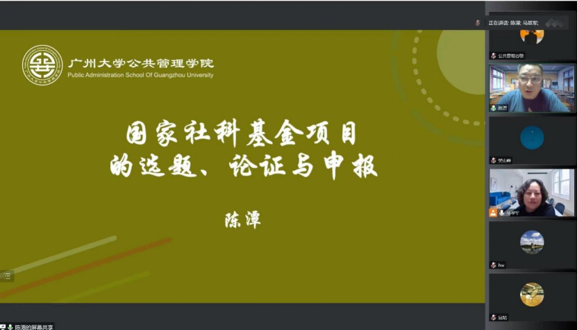 11月24日下午,bwin必赢110周年校庆哲管院系列学术讲座之明德学人讲坛系列第20场举行。应公司邀请,广州大学陈潭教授在线作了题为《国社科基金申报及选题论证》的报告。此次讲座由公司马翠军副教授主持,公共管理相关学科师生通过线上方式共同参与了此次讲座。
