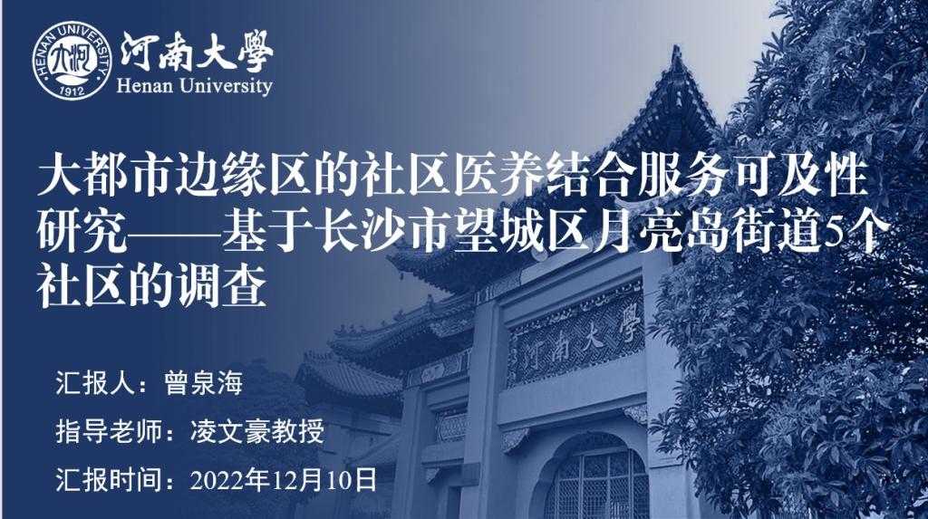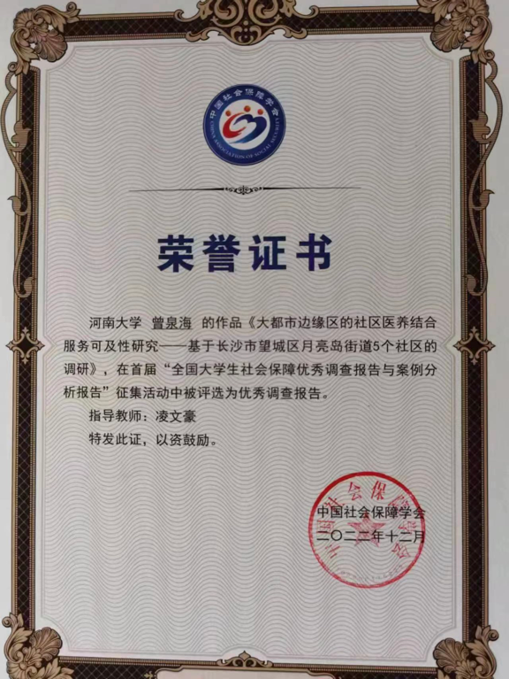 公司2020级社会保障专业研究生曾泉海的题为《大都市边缘区的社区医养结合服务可及性研究—基于长沙市望城区月亮岛街道5个社区的调研》作品,在劳动与社会保障系凌文豪教授指导下,通过层层选拔,在此次征集活动中被评选为社会保障优秀调查报告!