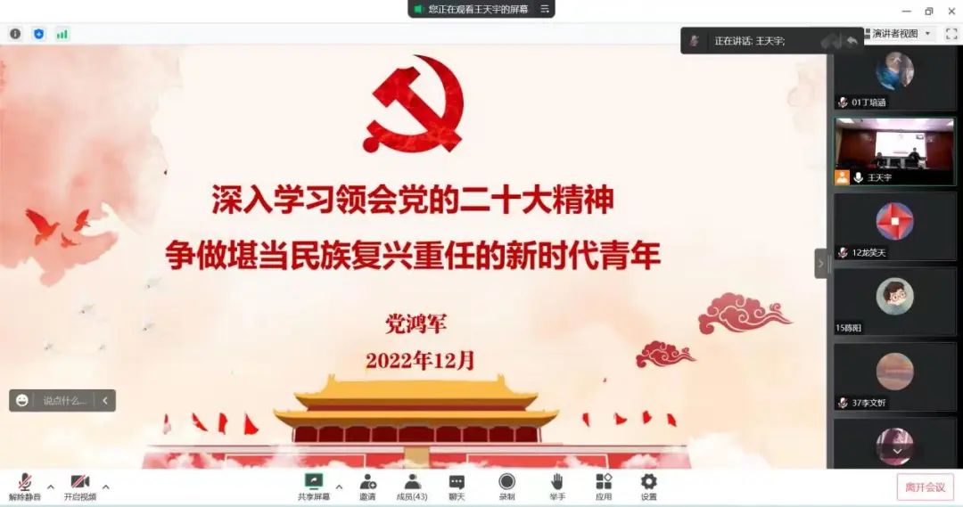 在报告中,党鸿军从党的二十大的主题、主要成果,过去五年的工作和新时代十年的伟大变革,马克思主义中国化时代化,中国式现代化,全面建设社会主义现代化国家的目标任务,坚持党的全面领导和全面从严治党,应对风险挑战等七个方面,进行了系统宣讲和阐释。并结合学院员工工作实际,向青马学员提出“四要”以作勉励。一要有理想追求。新青年要坚定对中国特色社会主义思想、中国特色社会主义道路的忠实信仰,做坚定的青年马克思主义者;二要敢担当担责。当代青年既要抓住社会进步所提供的丰厚机遇,亦更应主动自觉地承担起时代和国家所赋予的重要使命;三要能吃苦耐劳。同学们应摒弃“骄”“娇”二气,不断增强新青年的志气、骨气、底气,以过硬作风和过硬本领勇担使命;四要有昂扬面貌。新青年应拒绝“躺平”“摆烂”所带来的精神内耗,以积极进取的姿态扎根于社会实践、服务于祖国人民。