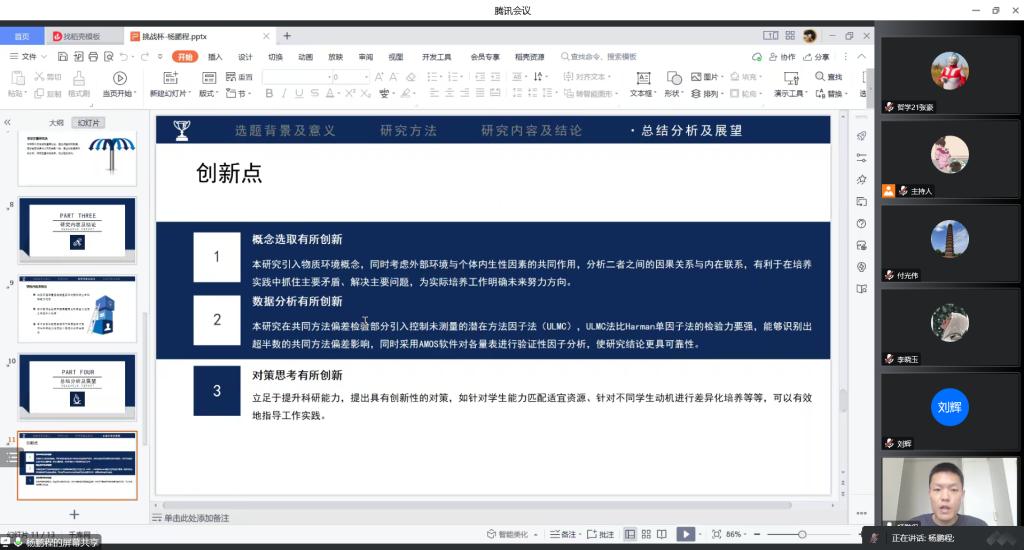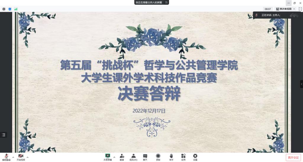 为鼓励员工将科学理论运用于社会实际,通过实践锻炼提高学术能力,12月17日,第五届“挑战杯”bwin官网老员工课外学术科技作品竞赛答辩于线上举行。行政管理系教授刘辉、劳动与社会保障副教授李晓玉、社会工作系副教授付光伟担任本次答辩评委,15支入围决赛团队参加答辩。
