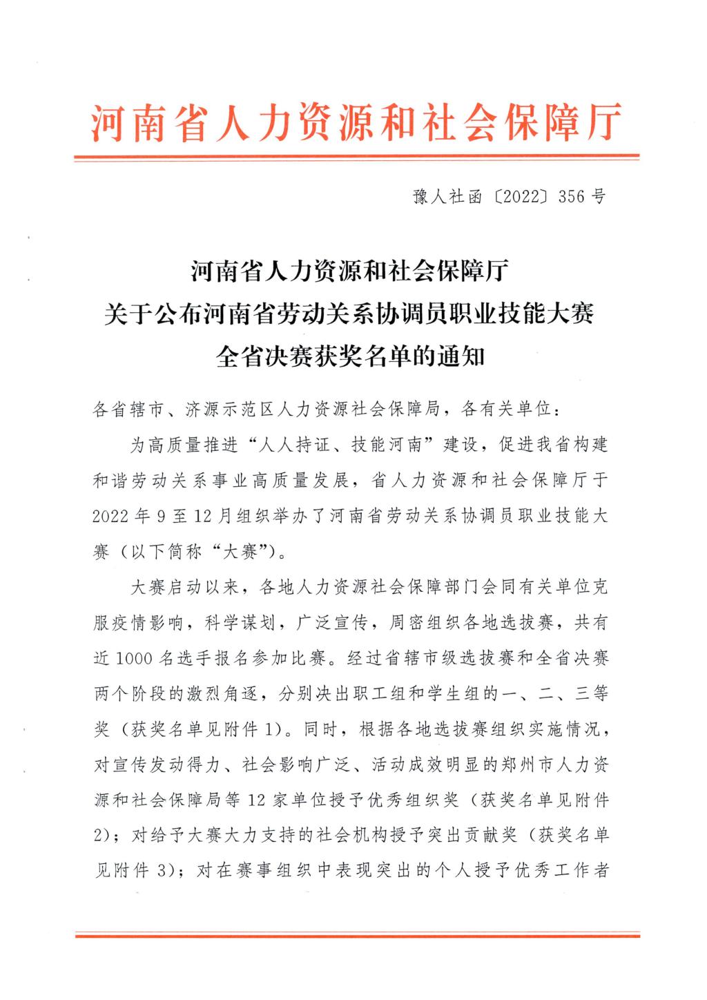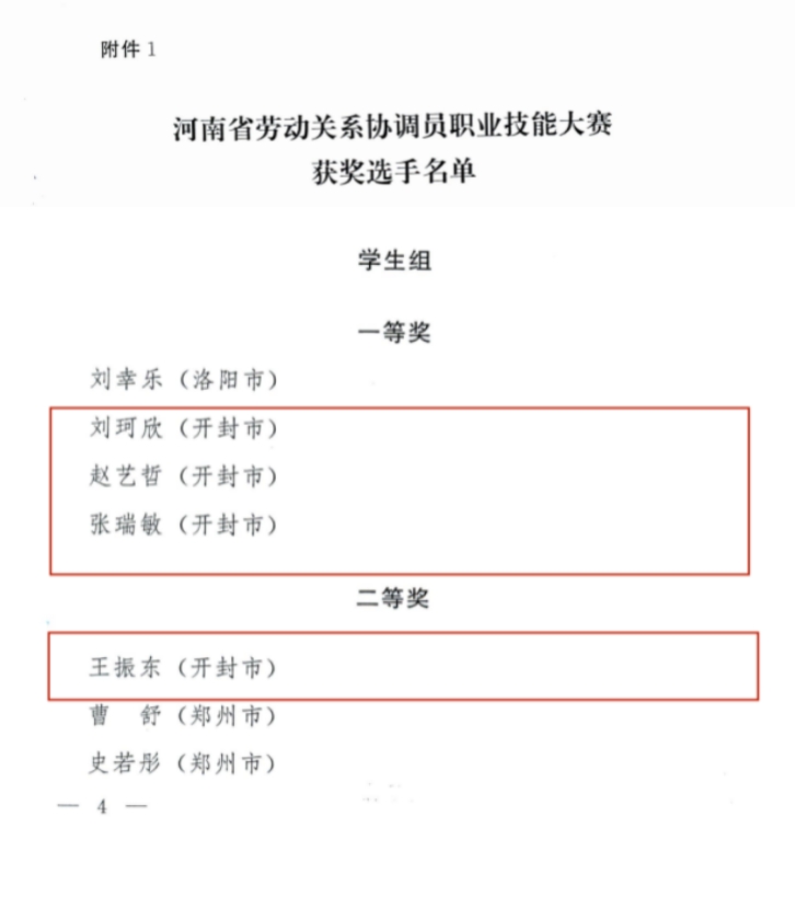 日前,河南省人力资源和社会保障厅公布了“河南省劳动关系协调员职业技能大赛”全省决赛获奖名单(豫人社函【2022】356号)。公司劳动与社会保障本科专业2019级员工刘珂欣、张瑞敏和2020级员工赵艺哲获大赛员工组一等奖(全省员工组一等奖获奖人数仅4人),占全省员工组获奖总数的75%。2019级王振东获省级二等奖(全省员工组二等奖获奖人数仅5人)。bwin必赢获突出贡献奖。
