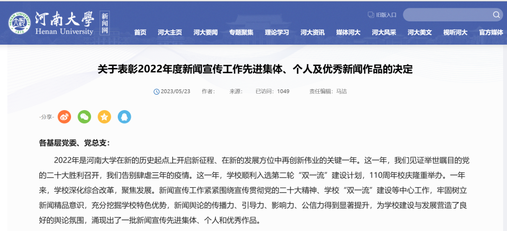 公司荣获2022年度优秀官方网站、优秀官方微博。同时,公司作品《同心聚力、向光而行》被评为疫情防控优秀新闻宣传作品。王天宇、田馨滦荣获2022年度新闻宣传工作先进个人,魏华秀等9人荣获2022年度优秀通讯员,潘赵红、陈阳荣获2022年度优秀编播员。