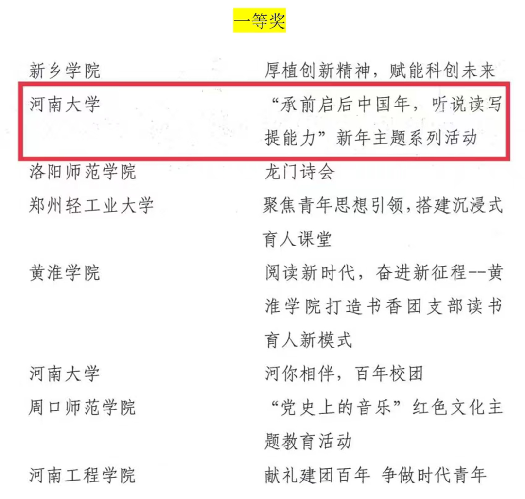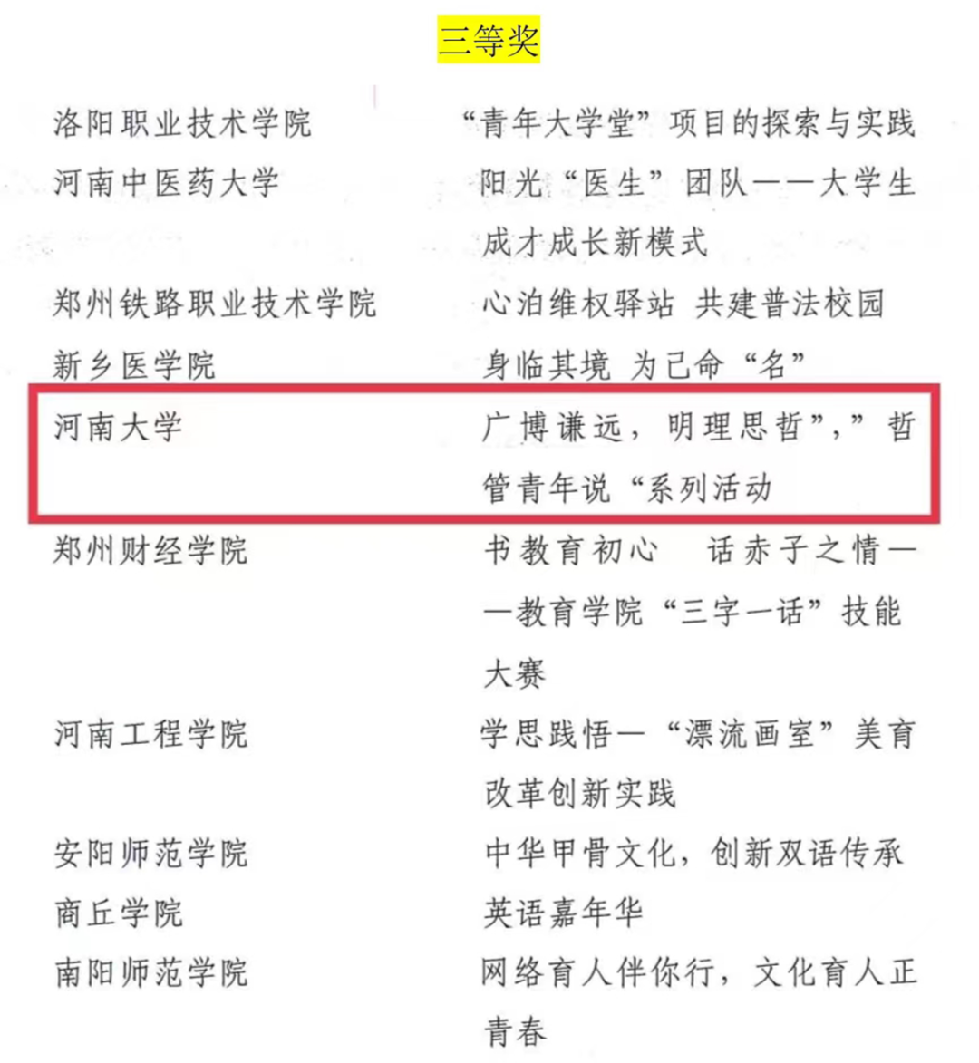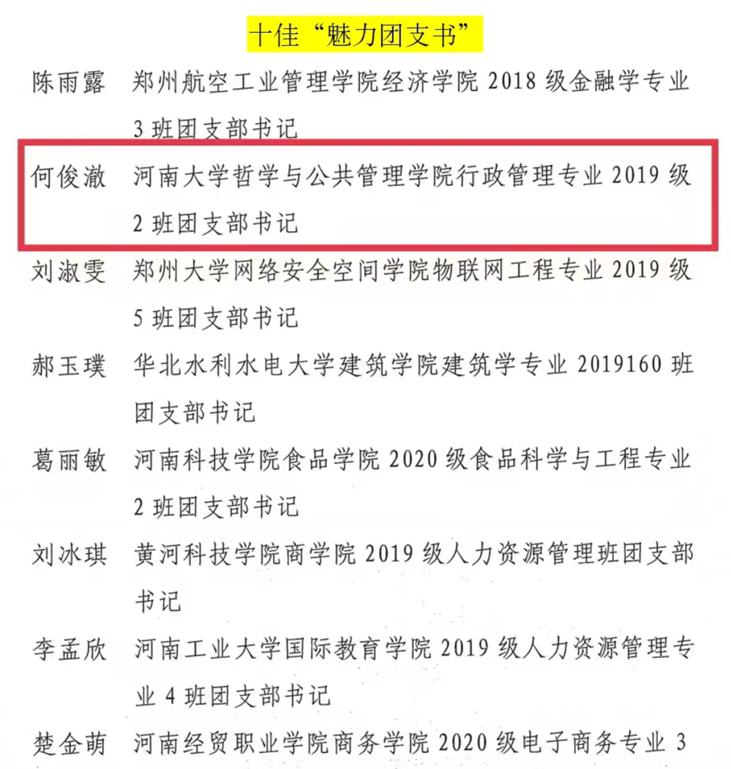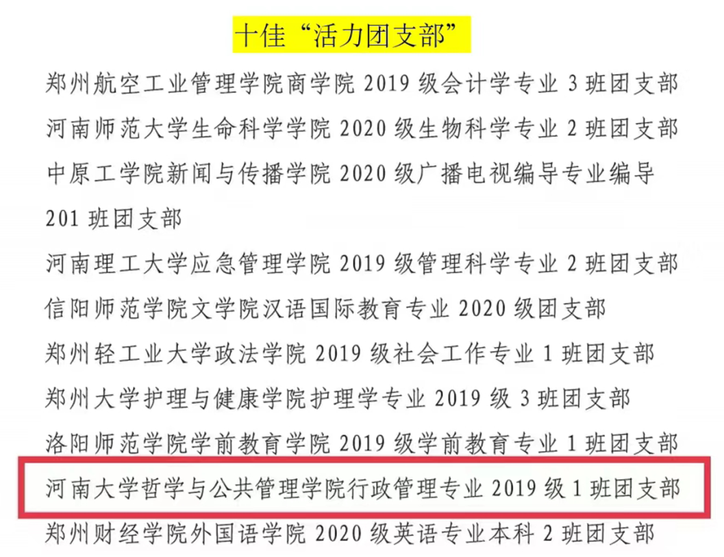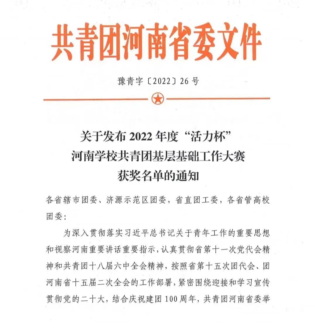 近日,共青团河南省委发布了2022年度“活力杯”河南学校共青团基层基础工作大赛获奖名单。公司“承前启后中国年,听说读写提能力”新年主题系列活动和“广博谦远,明理思哲”“哲管青年说”系列活动荣获共青团工作项目大赛一、三等奖,行政管理专业2019级1班团支部获十佳“活力团支部”奖项,行政管理专业2019级2班何俊澈获十佳“魅力团支书”称号。